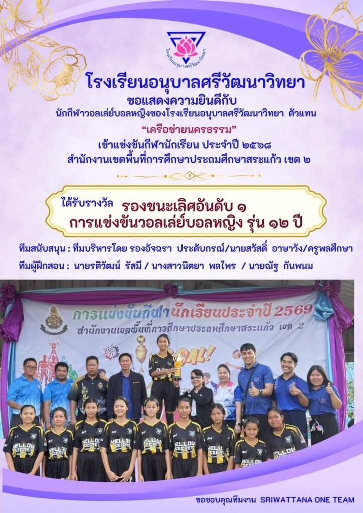 โรงเรียนอนุบาลศรีวัฒนาวิทยา ขอแสดงความยินดีกับนักกีฬาวอลเลย์บอลหญิงของโรงเรียนอนุบาลศรีวัฒนาวิทยา ตัวแทน“กลุ่มเครือข่ายนครธรรม” ได้รับรางวัล รองชนะเลิศอันดับที่ 1 กีฬาวอลเลย์บอลหญิง รุ่นอายุไม่เกิน 12 ปี การแข่งขันกีฬานักเรียน ประจำปี 2568 สำนักงานเขตพื้นที่การศึกษาประถมศึกษาสระแก้ว เขต 2