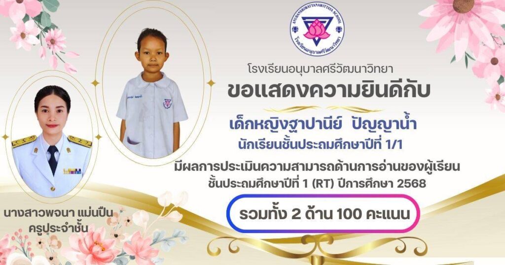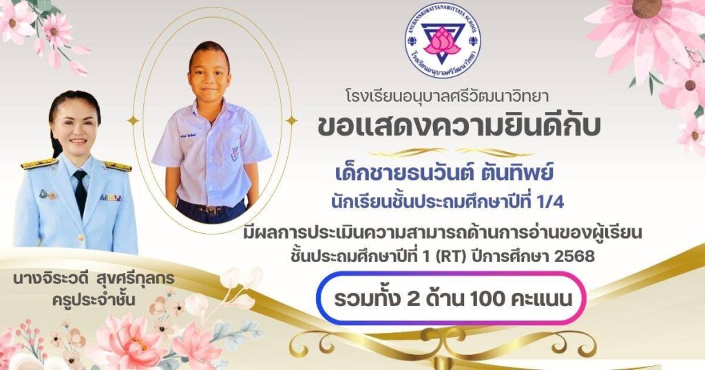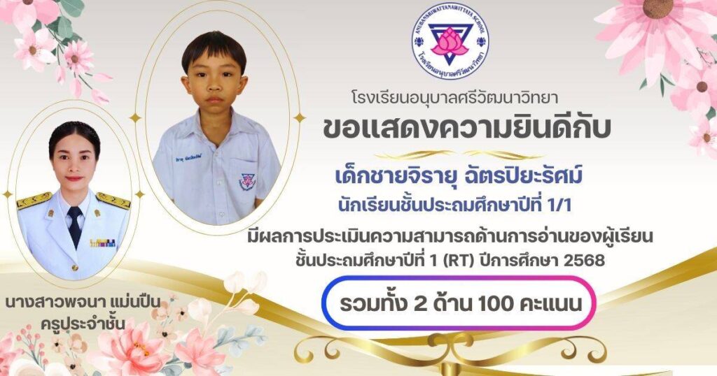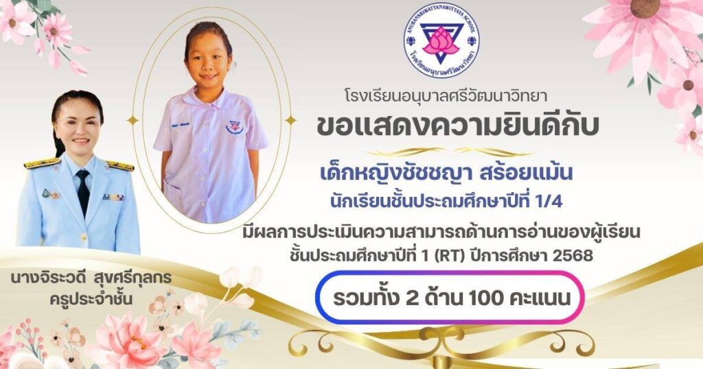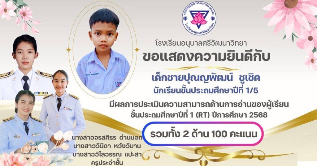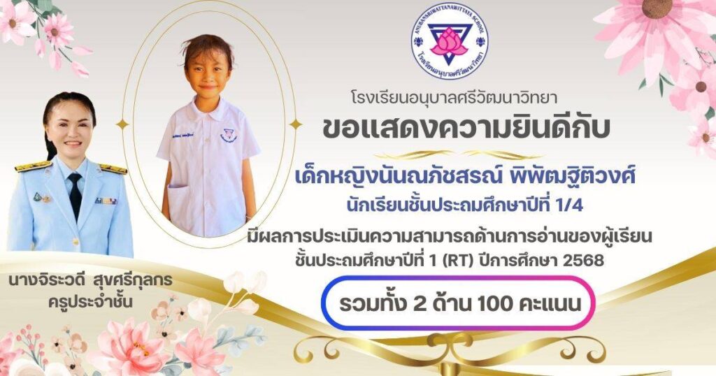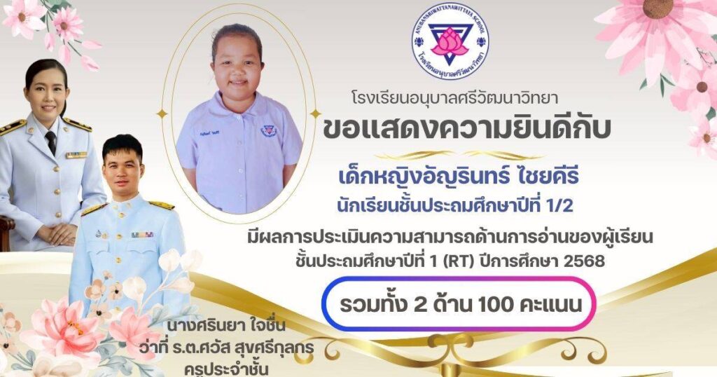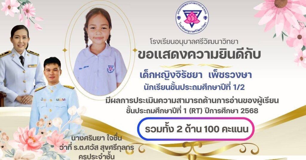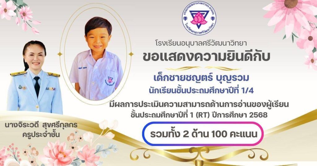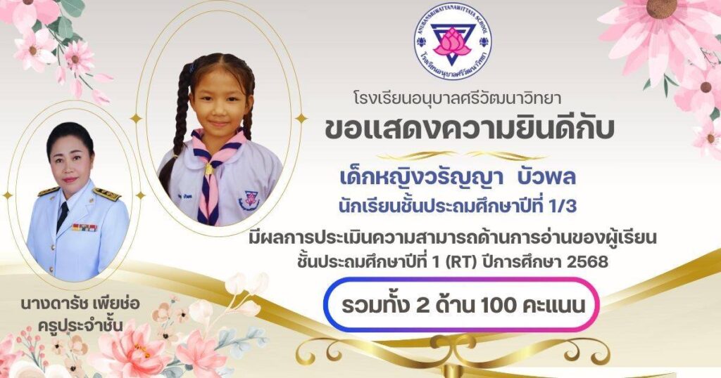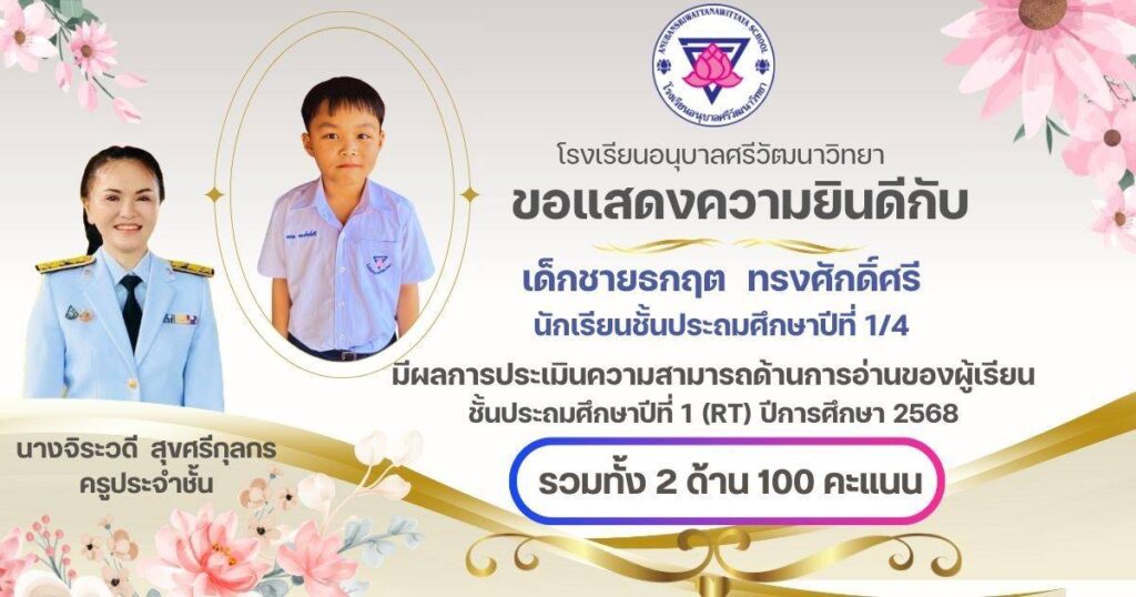 ขอแสดงความยินดีกับนักเรียนชั้น ป.1 ครูประจำชั้น และครูผู้สอนวิชาภาษาไทยที่ได้คะแนนเต็ม 100 คะแนน จากการประเมินความสามารถในการอ่านของผู้เรียน (Reading Test : RT ) กุมภาพันธ์ 24, 2026เมษายน 7, 2026 อสมากรณ์ บุญธรรม กิจกรรมวิชาการ, ข่าวครูและบุคลากร, ข่าวประชาสัมพันธ์ ขอแสดงความยินดีกับนักเรียนชั้นประถมศึกษาปีที่ 1 ครูประจำชั้น และครูผู้สอนวิชาภาษาไทยที่ได้คะแนนเต็ม 100 คะแนน จากการประเมินความสามารถในการอ่านของผู้เรียน (Reading Test : RT ) ของระดับชั้นประถมศึกษาปีที่ 1 โรงเรียนอนุบาลศรีวัฒนาวิทยา ปีการศึกษา 2568 อสมากรณ์ บุญธรรม