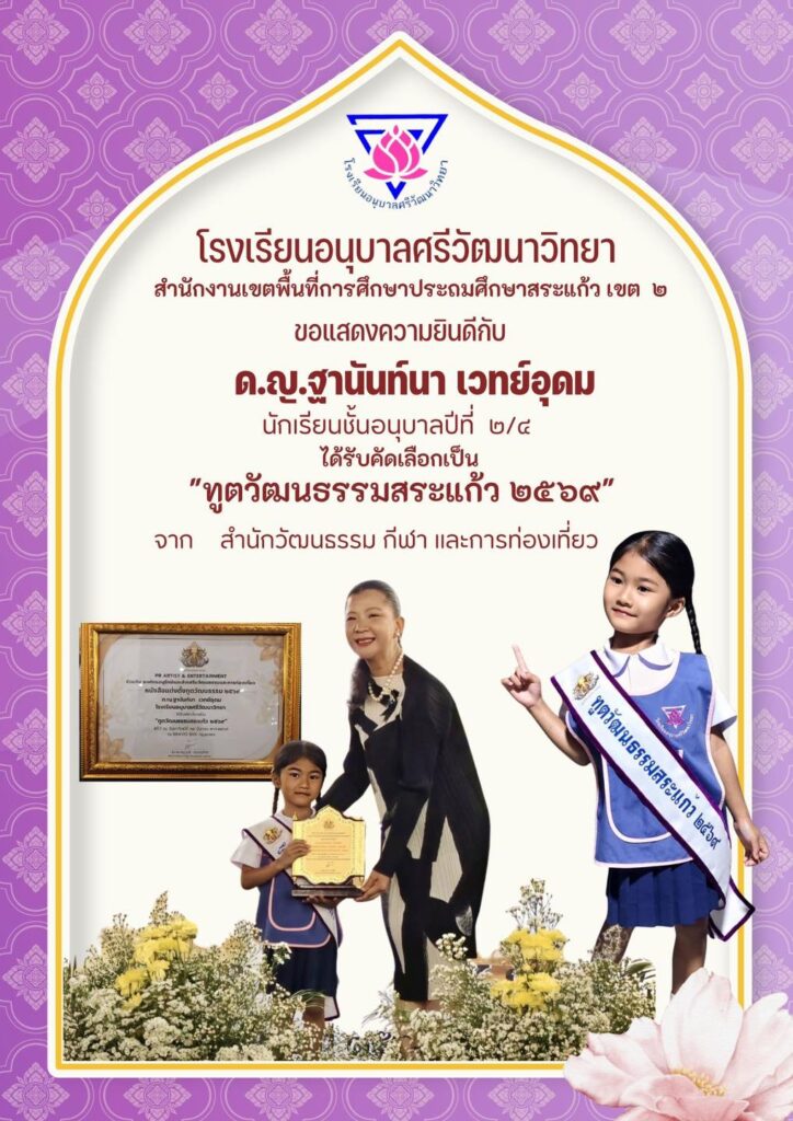 ขอแสดงความยินดีกับ เด็กหญิงฐานันท์นา เวทย์อุดม นักเรียนชั้นอ. ๒/๔ ที่ได้รับคัดเลือกเป็น “ทูตวัฒนธรรมสระแก้ว ๒๕๖๙” จากสำนักวัฒนธรรม กีฬา และการท่องเที่ยว มีนาคม 16, 2026เมษายน 7, 2026 อสมากรณ์ บุญธรรม ข่าวครูและบุคลากร, ข่าวประชาสัมพันธ์, งานสัมพันธ์ชุมชน โรงเรียนอนุบาลศรีวัฒนาวิทยา สำนักงานเขตพื้นที่การศึกษาประถมศึกษาสระแก้ว เขต ๒ ขอแสดงความยินดีกับ เด็กหญิงฐานันท์นา เวทย์อุดม นักเรียนชั้นอนุบาลปีที่ ๒/๔ ที่ได้รับคัดเลือกเป็น “ทูตวัฒนธรรมสระแก้ว ๒๕๖๙” จากสำนักวัฒนธรรม กีฬา และการท่องเที่ยว อสมากรณ์ บุญธรรม