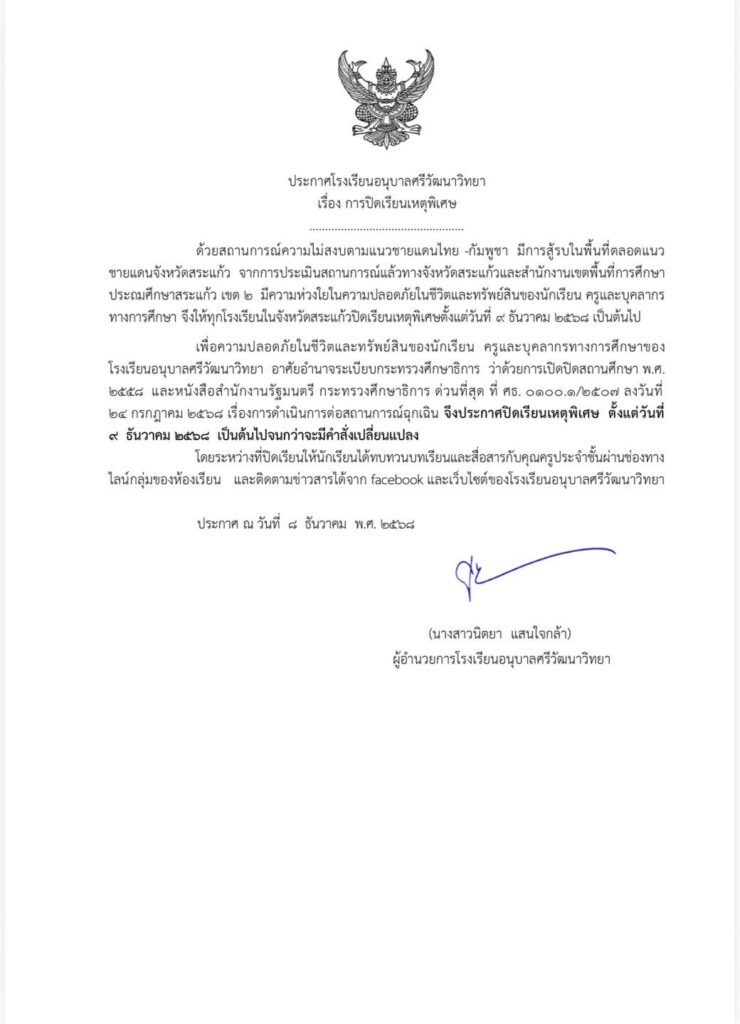 โรงเรียนอนุบาลศรีวัฒนาวิทยา “ประกาศปิดเรียนเหตุพิเศษ”
