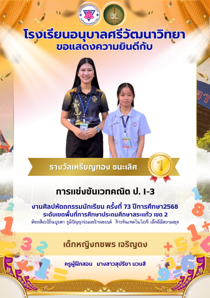 1. รางวัลเหรียญทอง ชนะเลิศ การแข่งขันเวทคณิต ป.1-ป.3