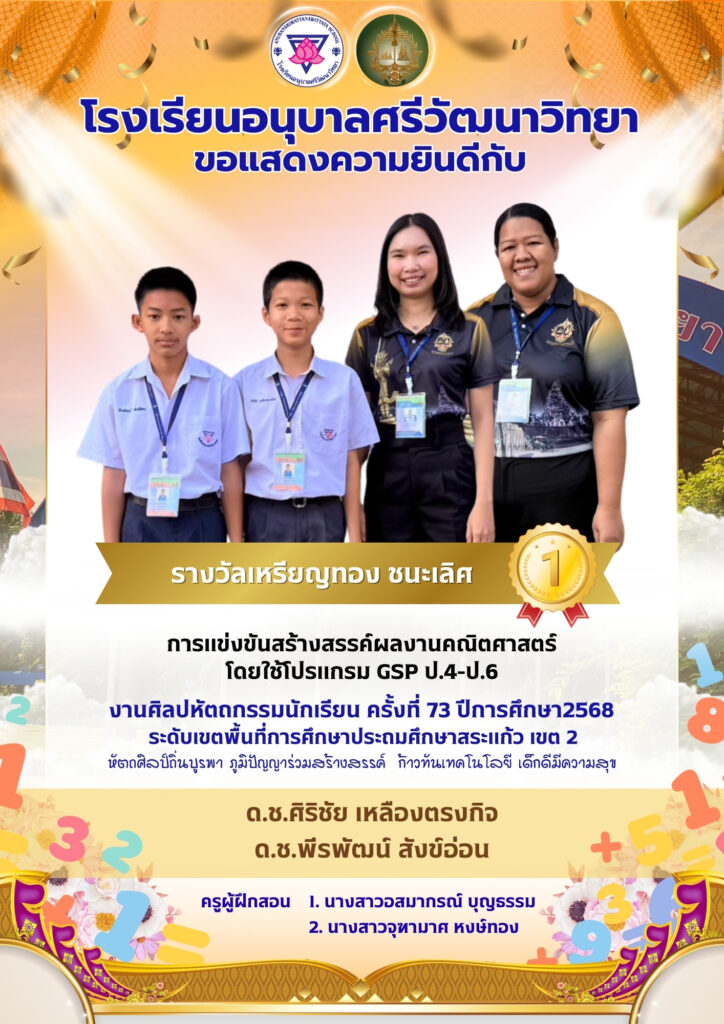 2. รางวัลเหรียญทอง ชนะเลิศ การแข่งขันสร้างสรรค์ผลงานคณิตศาสตร์โดยใช้โปรแกรม GSP ป.4-ป.6