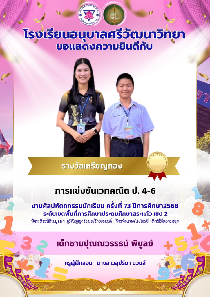 โรงเรียนอนุบาลศรีวัฒนาวิทยา ขอแสดงความยินดีกับนักเรียน และครูผู้ฝึกซ้อมกลุ่มสาระการเรียนรู้คณิตศาสตร์