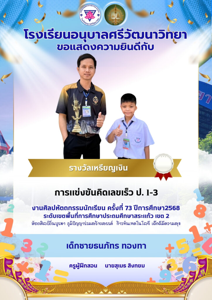 4. รางวัลเหรียญเงิน การแข่งขันคิดเลขเร็ว ป.1-ป.3