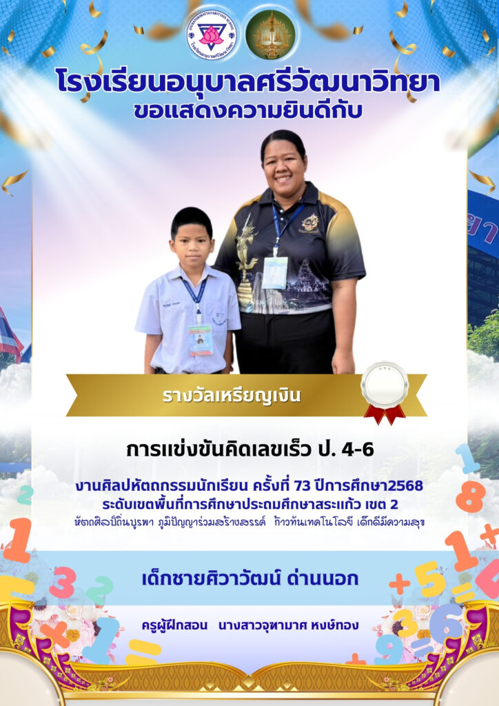 5. รางวัลเหรียญเงิน การแข่งขันคิดเลขเร็ว ป.4-ป.6