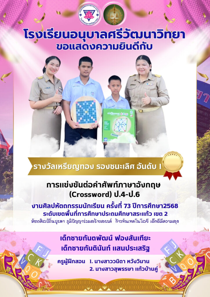 1. รางวัลเหรียญทอง รองชนะเลิศ การแข่งขันต่อคำศัพท์ภาษาอังกฤษ (Crossword) ป.4-ป.6