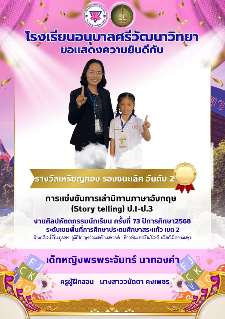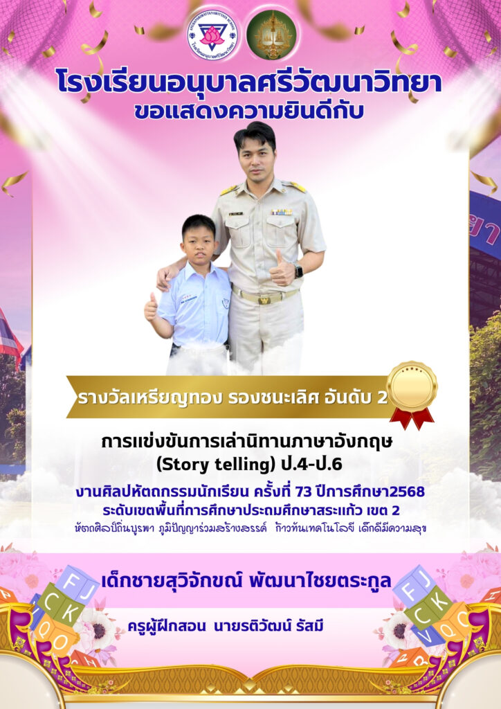 4. รางวัลเหรียญทอง รองชนะเลิศ อันดับ 2 การแข่งขันการเล่านิทานภาษาอังกฤษ (Story telling) ป.4-ป.6