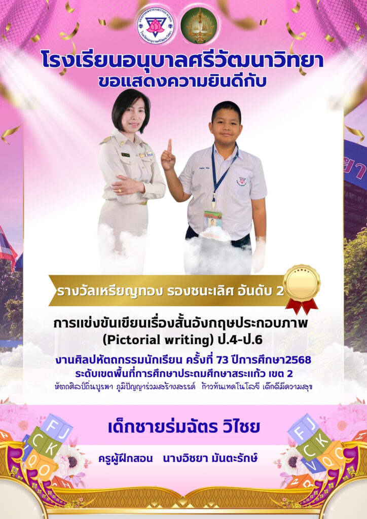 2. รางวัลเหรียญทอง รองชนะเลิศ อันดับ 2 การแข่งขันเขียนเรื่องสั้นอังกฤษประกอบภาพ (Pictorial writing) ป.4-ป.6