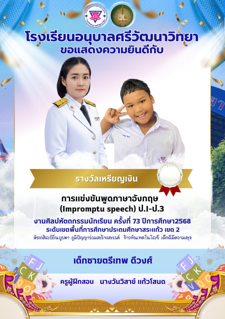 5. รางวัลเหรียญเงิน การแข่งขันพูดภาษาอังกฤษ (Impromptu speech) ป.1-ป.3
