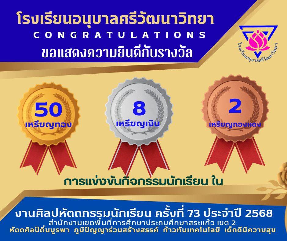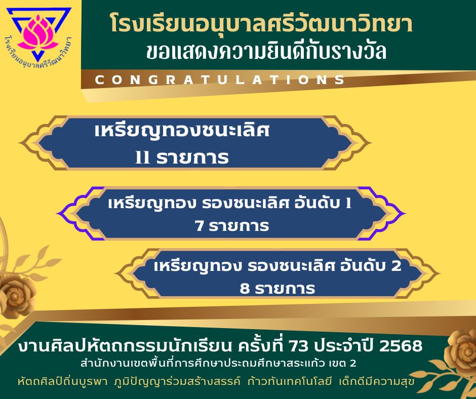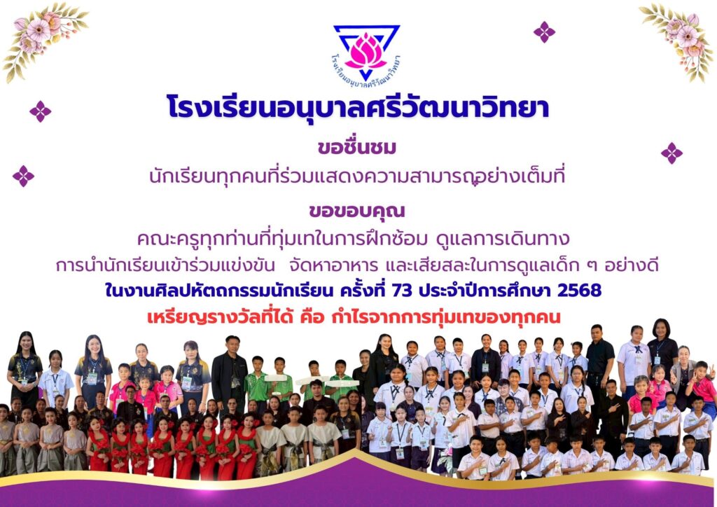 สรุปผลการแข่งขันศิลปหัตกรรมนักเรียน ครั้งที่ 73 ขอชื่นชมนักเรียนทุกคนที่ร่วมแสดงความสามารถอย่างเต็มที่ และขอขอบคุณคณะครูทุกท่านที่ได้ทุ่มเทในการฝึกซ้อม