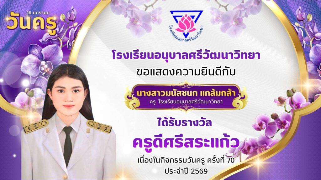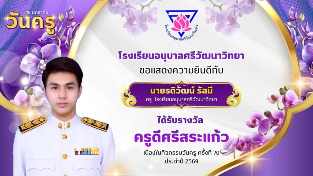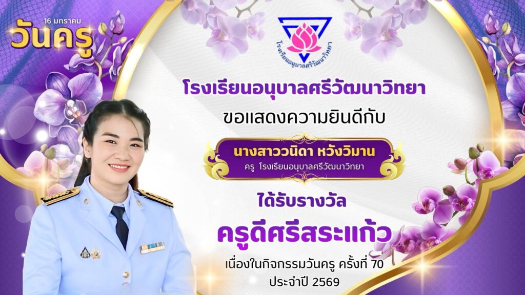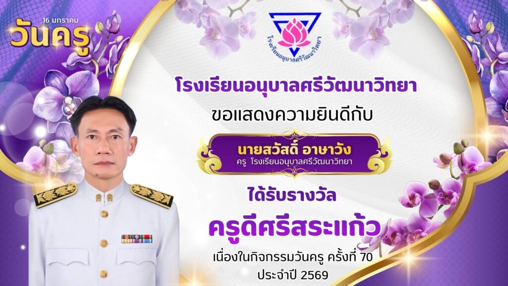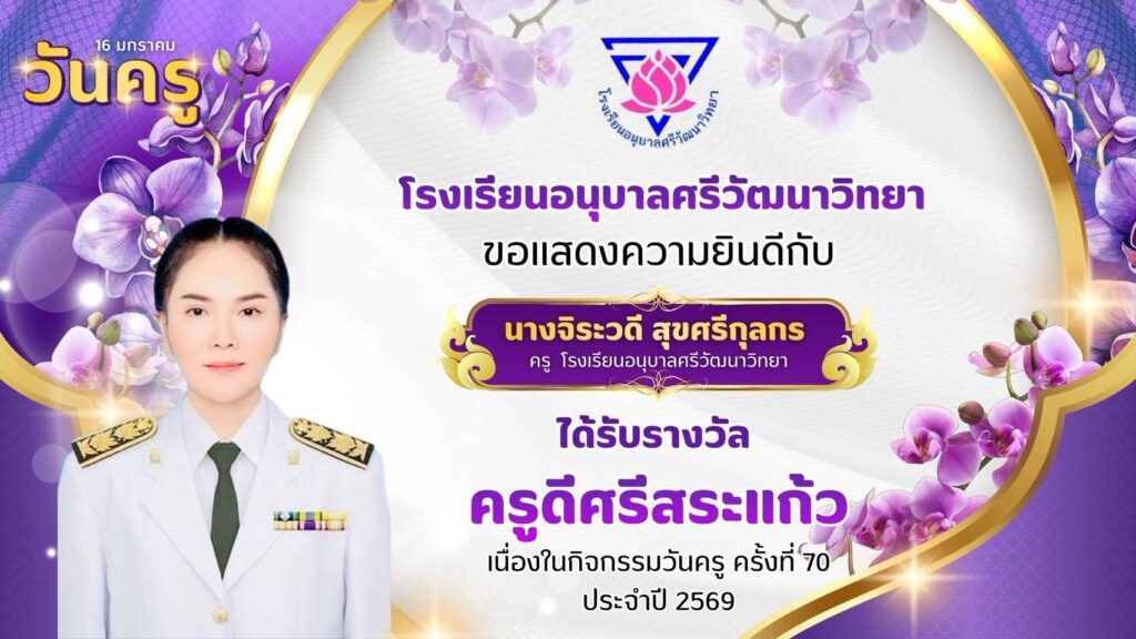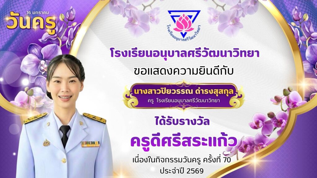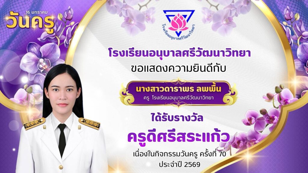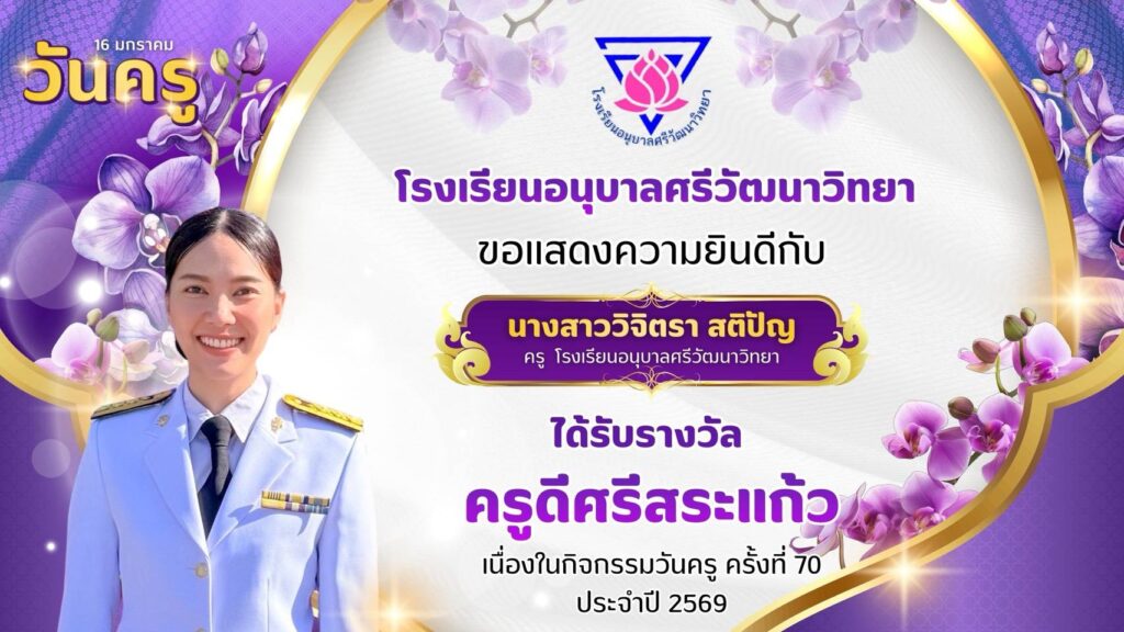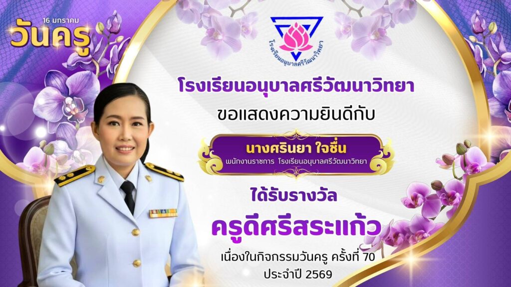 โรงเรียนอนุบาลศรีวัฒนาวิทยา ขอแสดงความยินดีกับคณะครูโรงเรียนอนุบาลศรีวัฒนาวิทยาที่ได้รับรางวัล “ครูดีศรีสระแก้ว” มกราคม 13, 2026มกราคม 13, 2026 อสมากรณ์ บุญธรรม ข่าวครูและบุคลากร, ข่าวประชาสัมพันธ์ โรงเรียนอนุบาลศรีวัฒนาวิทยา ขอแสดงความยินดีกับคณะครูโรงเรียนอนุบาลศรีวัฒนาวิทยา ที่ได้รับรางวัล “ครูดีศรีสระแก้ว” เนื่องในกิจกรรมวันครู ครั้งที่ 70 ประจำปี 2569 อสมากรณ์ บุญธรรม