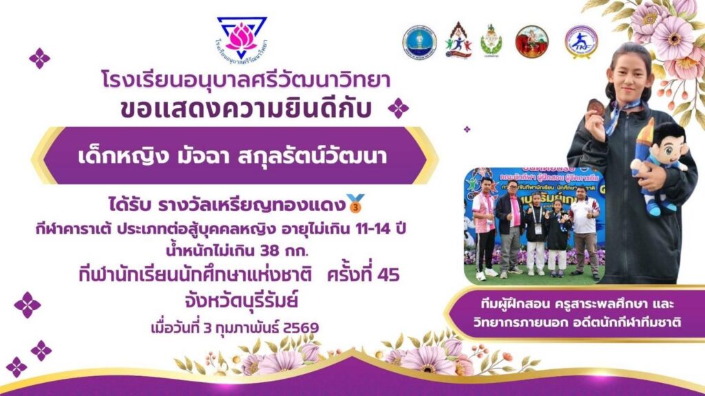 โรงเรียนอนุบาลศรีวัฒนาวิทยา ขอแสดงความชื่นชม และยินดีกับ เด็กหญิงมัจฉา สกุลรัตน์วัฒนา นักเรียนชั้นประถมศึกษาปีที่ 5/3 ทีมผู้ฝึกสอนครูกลุ่มสาระสุขศึกษาและพลศึกษา และนายพีระพงษ์ วงค์เวียน อดีตนักกีฬาทีมชาติ ได้รับรางวัลเหรียญทองแดง กีฬาคาราเต้ ประเภทต่อสู้บุคคลหญิง อายุไม่เกิน 11-14 ปี น้ำหนักไม่เกิน 38 กิโลกรัม กีฬานักเรียนนักศึกษาแห่งชาติ ครั้งที่ 45 “ฅนบุรีรัมย์เกมส์” ณ จังหวัดบุรีรัมย์ เมื่อวันที่ 3 กุมภาพันธ์ 2569