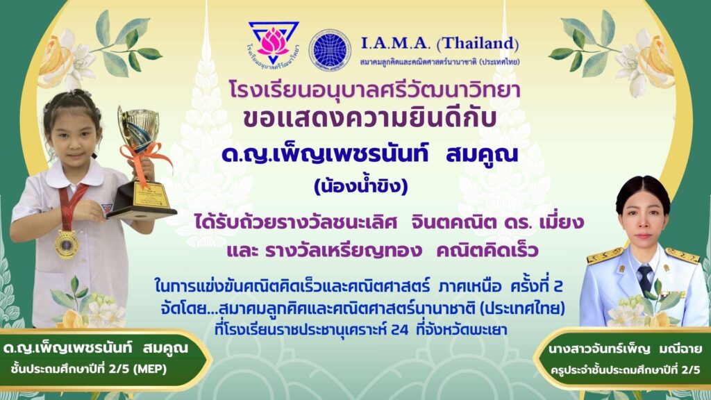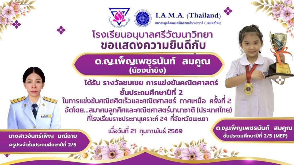 ในการแข่งขันคณิตคิดเร็วและคณิตศาสตร์ ภาคเหนือ ครั้งที่ 2 จัดโดยสมาคมลูกคิดและคณิตศาสตร์นานาชาติ(ประเทศไทย) ณ โรงเรียนราชประชานุเคราะห์ 24 จังหวัดพะเยา เมื่อวันที่ 21 กุมภาพันธ์ 2569