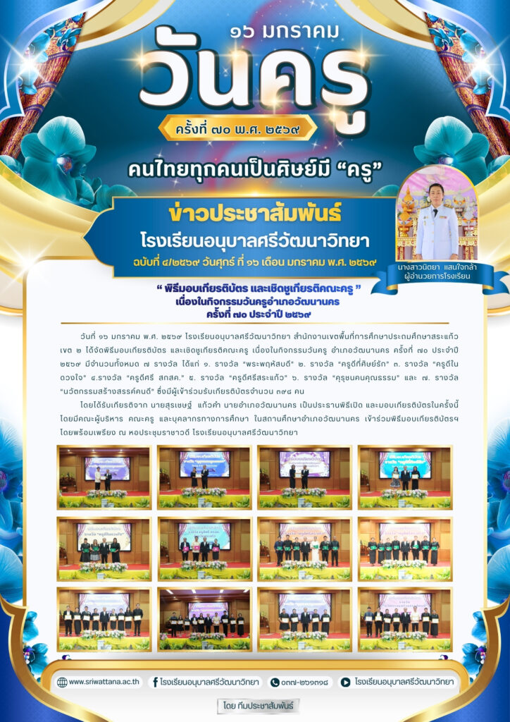 พิธีมอบเกียรติบัตร และเชิดชูเกียรติคณะครู ” เนื่องในกิจกรรมวันครูอำเภอวัฒนานคร ครั้งที่ ๗๐ ประจำปี ๒๕๖๙ ณ หอประชุมราชาวดี โรงเรียนอนุบาลศรีวัฒนาวิทยา มกราคม 20, 2026มกราคม 20, 2026 อสมากรณ์ บุญธรรม เอกสารประชาสัมพันธ์ อสมากรณ์ บุญธรรม