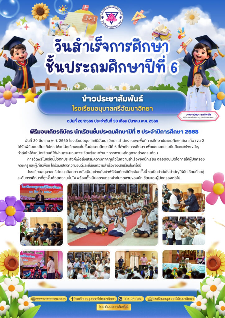 พิธีมอบเกียรติบัตร ในวันสำเร็จการศึกษาของนักเรียนชั้นประถมศึกษาปีที่ 6 ประจำปีการศึกษา 2568 มีนาคม 30, 2026เมษายน 7, 2026 อสมากรณ์ บุญธรรม เอกสารประชาสัมพันธ์ อสมากรณ์ บุญธรรม
